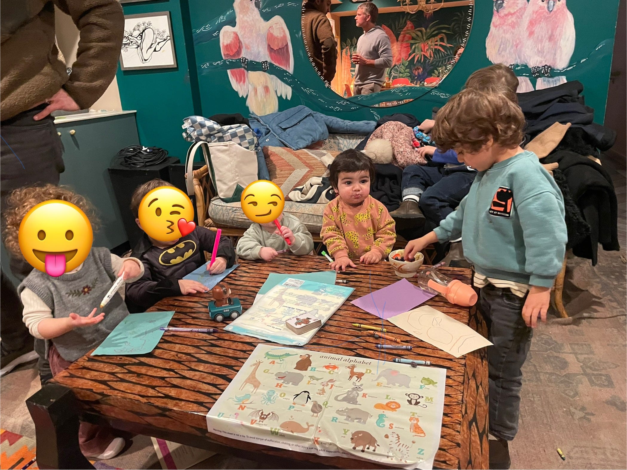 “Parallel Parenting”: In the almost 4 years since I became a mom, I’ve struggled to make mom friends I really connect with in a casual like-family way in my neighborhood — the kind you can have over without cleaning your house. Well I feel like I finally reached the next level in the video game, when a group of us spontaneously took over a private room in a local restaurant, brought toys, children, and husbands, and ate brunch while our kids played, screamed, laughed, ate pancakes, and took turns trying to escape from the room. Doing chaos together is better than doing it alone!
